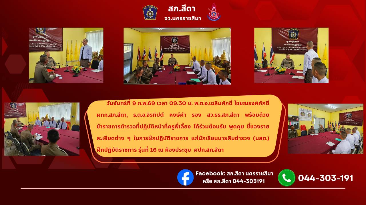 วันพฤหัสบดีที่ 7 ส.ค.68 เวลา 09.00 น. ร.ต.ท.ชัยวุฒิ อุทัยรัตน์ รอง สว.(ป.) สภ.สีดา พร้อมเจ้าหน